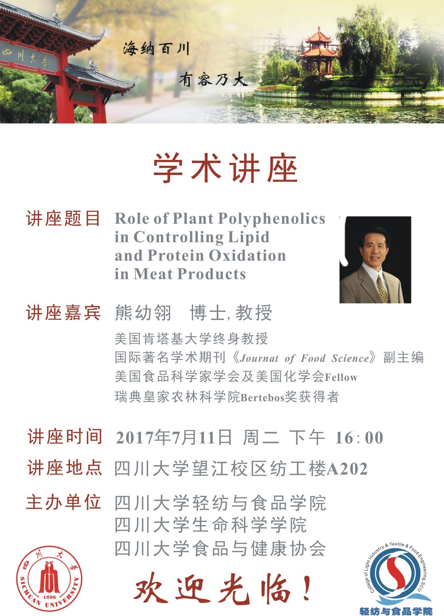 报告题目:Role of Plant Polyphenolics in Controlling Lipid and Protein Oxidation in Meat Products 报告人:美国肯塔基大学熊幼翎博士教授 报告时间:2017年7月11日(星期二)下午16:00 报告地点:四川大学轻纺与食品学院纺工楼A202 报告人简介:熊幼翎博士现为美国肯塔基大学终身教授、美国食品科学家联合会(Institute of Food Technologists)会刊《Journal of Food Science》副主编,江南大学高层次人才,先后获得美国肯塔基大学杰出研究科学家奖、美国肉品科学协会杰出研究奖、杰出成就奖、美国化学会青年科学家奖、瑞典皇家农林科学院Bertebos奖等多项学术奖励。熊幼翎教授在食品科学与营养领域教学和研究二十多年,在食品科学与技术尤其是食品蛋白质化学和肉品加工领域取得了世界领先的开创性成就,完成多项科研项目,发表SCI论文170多篇、会议论文180篇、出版专著4部、参编书章20多篇,是国际知名的食品蛋白质化学家。
