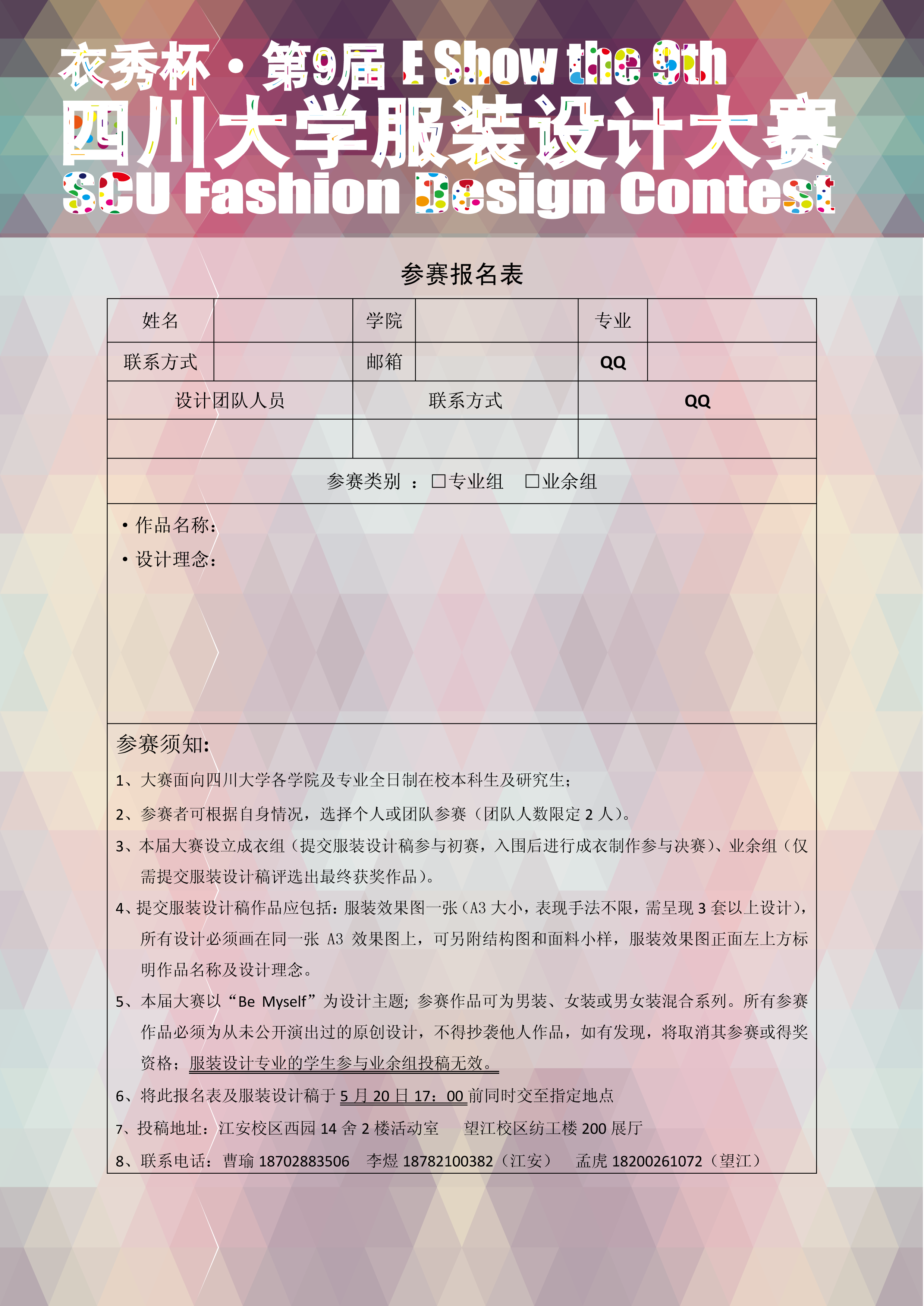 业余组一等奖1名(奖金+校级证书)二等奖2名(奖金+校级证书)三等奖3名(奖金+校级证书)九、联络方式投稿地址:江安校区西园14舍2楼活动室 望江校区纺工楼200展厅(5月20日17::00截稿)联系电话:曹瑜18702883506 李煜18782100382(江安) 孟虎18200261072(望江)电子邮箱:2745137613@qq.com微信公共主页:轻纺团委学生会 人人网公共主页@衣秀杯服装设计大赛 第九届衣秀杯服装设计大赛报名表.png 四川大学第九届衣秀杯创意服装设计大赛组委会二〇一四年四月
