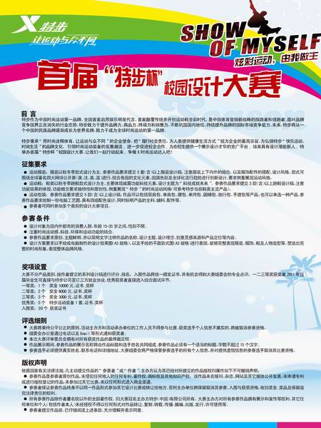 炫彩运动我做主首届“特步杯”校园设计大赛方案 一、前言特步作为中国时尚运动第一品牌,全国首家启用娱乐明星代言,首家颠覆传统并开创运动鞋全彩时代,是中国体育营销新战略的探路者和领跑者。面对品牌竞争国界正在消失的行业态势,特步致力于提升品牌力、商品力、终端力和销售力,不断巩固国内地位,持续提升品牌的国际市场竞争能力。未来,特步将从一个中国的民族品牌逐渐成长为世界名牌,致力于成为全球时尚运动的第一品牌。特步秉承“用时尚诠释体育,让运动与众不同”的企业使命,把“履行社会责任,为人类提供健康生活方式”视为企业的最高宗旨。为弘扬特步“快乐运动、时尚生活”的品牌文化,引领时尚运动装备的发展潮流,进一步促进校企合作,为在校生提供一个展示设计才华的宽广平台,培育具有设计潜能新人,特举办炫彩运动我做主首届“特步杯”校园设计大赛。让我们一起行动起来,争做X时尚运动达人吧!二、主题大赛主题:炫丽多彩的运动装备,焕发出人们健康、阳光、快乐的生命活力和独特的个性风采——X炫彩运动,由我做主。我们的精神:运动是一种坚持我们的生活:运动是一种态度我们的口号:炫彩运动我做主我们的梦想:运动是一种生活三、组织机构主办单位:特步(中国)有限公司协办单位:四川大学承办单位:特步(中国)有限公司人力资源中心 四川大学轻纺与食品学院宣传支持:特步(中国)有限公司品牌中心、企业文化部四川大学轻纺与食品学院就业指导中心四、大赛组委会(排名不分先后)组织委员会总 顾 问:丁水波 特步(中国)有限公司总裁陈武勇 四川大学轻纺与食品学院院长顾 问:丁美清 特步(中国)有限公司副总裁王家业 特步(中国)有限公司副总裁丁明忠 特步(中国)有限公司副总裁兰建武 四川大学轻纺与食品学副院长主 任:刘庆先 特步(中国)有限公司副总裁委 员:彭立明 王诚中 李广远 王志瑜 徐 波