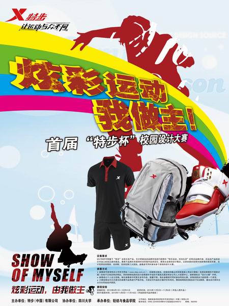 成 员:李巧滨 沈贵东 林炳城五、征集要求设计构思可侧重于“特步”当前主流产品,充分把握运动品牌市场流行趋势和“快乐运动,时尚生活”的特步品牌内涵,在运动产品的设计中加入时尚元素和理念,着眼于品牌未来高端时尚形象和品类定位,展现出全新的设计概念,达到创意的效果和创新奇的视觉形象。设计包括以下类别,参赛者可同时参加多个类别的设计大赛。1、运动服装:服装以秋冬季款式设计为主,参赛作品要求提交5套(含)以上服装设计稿,注意服装上下内外的组合,以及服饰配件的搭配。设计风格、款式可围绕全球著名四大网球公开赛(澳、法、美、温)进行,结合各国的文化元素、国旗色彩及全球化流行趋势进行创新设计,要求侧重展现运动风格。2、运动鞋:鞋类以秋冬季跑鞋款式设计为主,主要体现减震功能科技元素,设计主题为“科技成就未来”。 参赛作品要求提交3款(含)以上跑鞋设计稿,注意功能效果的体现,功能概念要求独特性和原创性,侧重展现“特步”的时尚运动风格(可参考特步当前鞋类主流产品)。3、运动包袋:参赛作品要求提交5款(含)以上设计稿,作品可以包括双肩包、单肩包、腰包、单挎包、圆桶包、旅行包、手提包等产品,也可以单选一种产品。参赛作品要求绘制一份电脑工艺图,具有四组配色设计,同时标明产品的主料、辅料、配件等。六、参赛条件1、设计对象为国内外都市的消费人群,年龄15-35岁之间,性别不限。2、注重时尚运动感、科技、环保和运动功能的结合。3、参赛作品要求原创,主题鲜明,并以简明文字注明作品的名称、设计主题、设计理念、创意灵感来源和产品定位等内容。4、设计方案要求以手绘或电脑制作的设计效果图(A3规格),以及手绘的平面款式图(A3规格)进行表现,能够完整表现服装、帽饰、鞋及人物造型等,塑造出完整的时尚形象,表现整体品牌风格。5、参赛对象为在校学生。七、参赛方式1、参赛者可登录特步公司官方网站(www.xtep.com.cn),在线登记报名,在指定的截止时间前直接上传设计图稿(包括效果图和平面款式图)的电子文档至特步网站,同时邮寄纸质的设计效果图和手绘的平面款式图至特步公司人力资源中心,邮寄请标注“设计大赛”字样。2、参赛者以个人名义投稿,每位参赛者均可提交多件作品,数量不限。每名参赛者可同时参加两类比赛,但每类最多只能获得一个奖项。3、大赛组委会对正式提交的参赛作品将进行严格评选,为保证对作品的正确评价和导向,聘请高等院校服装设计专业教授、著名设计师和主办方共同组成评委团。八、赛程安排投稿时间:2010年8月1日—10月31日初评时间:2010年11月2日—11月6日(评选入围作品)终评/颁奖时间:2010年11月6日—11月16日(评选获奖作品并颁奖)九、奖项设置大赛不分产品类别,按作者提交的系列设计稿进行评分、排名;入围作品将统一颁发证书,并有机会得到大赛组委会的专业点评;一二三等奖获奖者2011年应届毕业生可直接与特步公司签订三方就业协议,优秀获奖者直接进入综合面试环节。一等奖:1个 奖金10000元、证书、奖杯二等奖:2个 奖金6000元、证书、奖杯三等奖:3个 奖金3000元、证书、奖杯优秀奖:5个 特步运动装备1套、证书、奖杯入围奖:30个 获奖证书十、评选细则1、大赛将秉持公平公正的原则,活动主办方和承办单位的工作人员不得参与比赛。获奖选手个人信息不属实的,将被取消参赛资格。2、组委会办公室通过电话以及Email等形式通知获奖者。3、本次大赛评审委员会拥有对所有获奖作品的最终裁定权。4、作品展示期间,参赛作品的展示名称将由作品标题和选手姓名共同组成。参赛作品必须有一个适当的标题,字数不超过15个汉字。5、参赛选手必须提供真实姓名、联系电话和详细地址。大赛组委会将严格保管参赛选手的所有个人信息,并对提供虚假信息的参赛选手取消其比赛资格。十一、版权声明依据国家有关法律法规,凡主动提交作品的“参赛者”或“作者”,主办方认为其已经对所提交的作品版权归属作如下不可撤销声明:1、参赛作品是参赛者原创作品,未侵犯任何他人的任何专利、著作权、商标权及其他知识产权;该作品未在报刊、杂志、网站及其它媒体公开发表,未申请专利或进行版权登记的作品,未参加过其它比赛,未以任何形式进入商业渠道。2、参赛者保证参赛作品终身不以同一作品形式参加其它设计比赛或转让给他方。否则主办单位将保留取消其参赛、入围与获奖资格,收回奖金、奖品及保留追究法律责任的权利。3、所有参赛作品除作者署名权以外的全部著作权,归大赛冠名主办企业特步(中国)有限公司所有,大赛主办方对所有参赛作品拥有展示和宣传等权利。其它任何单位和个人(包括作者本人)未经授权不得以任何形式对作品转让、复制、转载、传播、摘编、出版、发行、许可使用等。4、参赛者提交作品前,已仔细阅读上述条款,充分理解并表示同意。