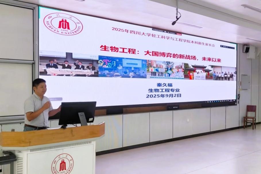 生物质与皮革工程系秦久福研究员介绍了专业内涵与学院优势。秦老师强调,生物制造已成为国家战略高地,在医疗、食品、工业转型等关键领域作用凸显。川大生物工程专业作为国家一流专业,坚持精英化培养,以创新课程、实战实训与双创支持为核心,为学生打造了高起点的学习与发展平台。