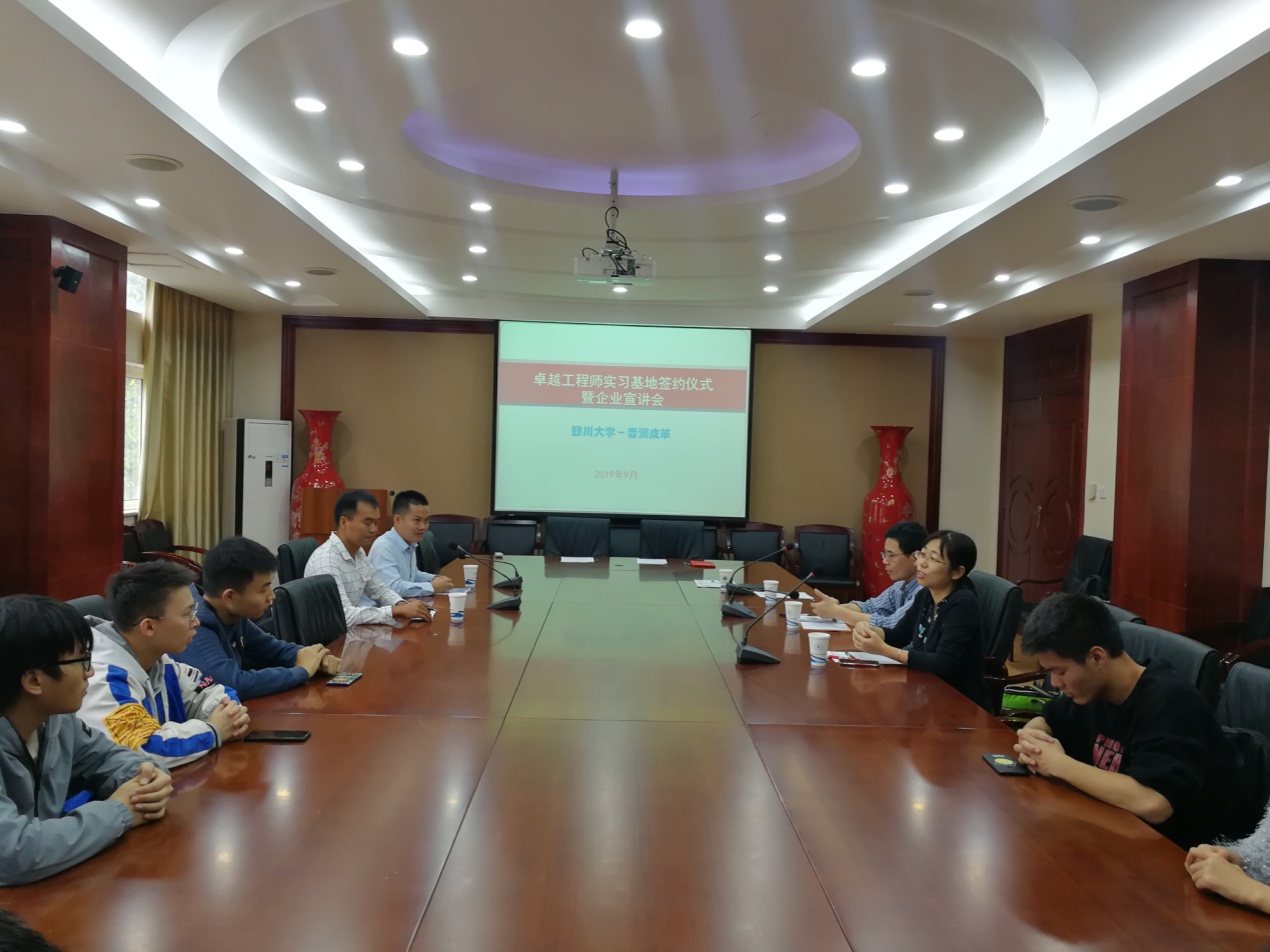 20191014日下午2:30,bw必威西汉姆联官网与漳洲香洲皮革有限公司“共建卓越工程师实习基地签字仪式暨企业宣讲会” 在皮革楼209会议室顺利举行。bw必威西汉姆联官网副院长彭必雨教授、生物质与皮革工程系系主任林炜教授、皮革工程教研室主任但年华副教授、漳洲香洲皮革有限公司执行副总林汉彬、人力行政部傅国润经理及2016级本科生出席了本次会议。