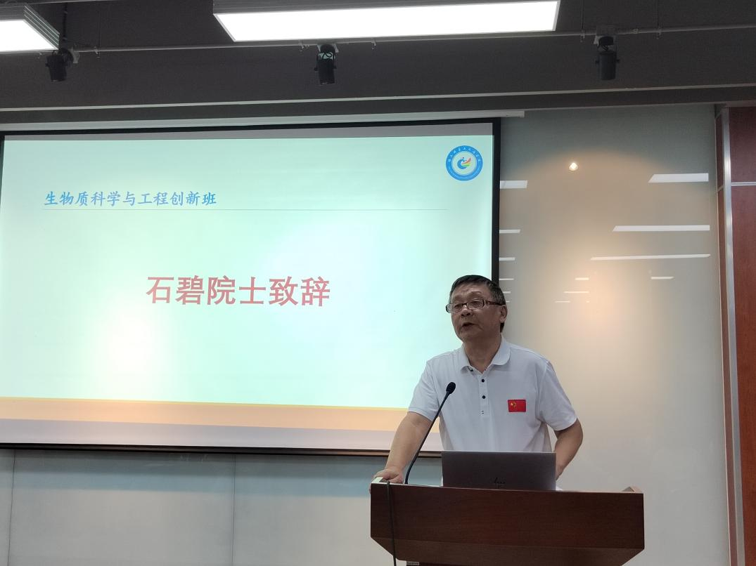 创新班名誉班主任石碧院士致辞。石老师从国家重大战略需求层面阐释了创新班的创建初衷,并详细介绍了生物质科学与工程创新班的定位与发展方向。石老师指出,生物质相关课题的研究是国家双碳目标聚焦的前沿研究领域,也是全球科学家现在和今后重点关注的研究领域,我们学院紧紧抓住这一重要契机,充分利用学院已有的生物质相关的专业基础和学科基础创建了生物质科学与工程创新班,顺应新工科的发展需要。希望同学们好好利用创新班这个具有学科交叉的特色平台,沉下心来、努力钻研,做自己喜欢的事情,成就精彩的人生。