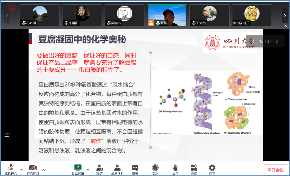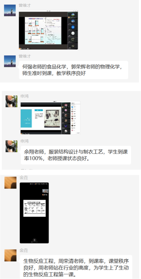 从检查情况来看,学院线上教学秩序总体良好,任课老师采用多种形式的教学手段进行有效互动,学生参与度高。如:何强教授的《食品化学》课程,设置“联席主持人”,协助任课老师进行线上教学准备与学生到课情况检查;周荣清教授的《生物反应工程》课程,到课率100%,课堂秩序良好,周教授站在行业的高度,为学生上了生动的生物反应工程第一课,有利于引导学生的学习兴趣和对专业的热爱;迟原龙副教授的《食品微生物学》课程,采用线上签到,学生到课率高、教学秩序良好,观看短视频增加学生对知识的感性认知,教师通过课堂提问与学生进行互动;时昱老师的《时装作品集制作》老师设计的问题很巧妙,与学生互动良好,课堂气氛活跃等。