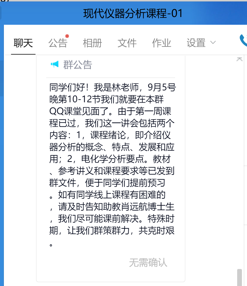学院师生认真做好了新学期的各项开课准备,能以良好的精神面貌贯彻教与学的要求。有教学任务的课程组按照校院两级的既定工作方案,认真细致地开展线上授课准备工作,包括课程QQ群或微信群的组建、授课平台的选择与测试、上传学习要求、教学大纲、电子教材、授课方式、课程考核方式等。学生按老师的要求加群、安装学习软件、课前预习。教务员通过共享表格实时更新课程开课信息,辅导员积极配合各课程组通知学生加群。截止于9月4日下午7点,各课程群已完成选课学生及学院督导人员入群、上传学习资料等工作。