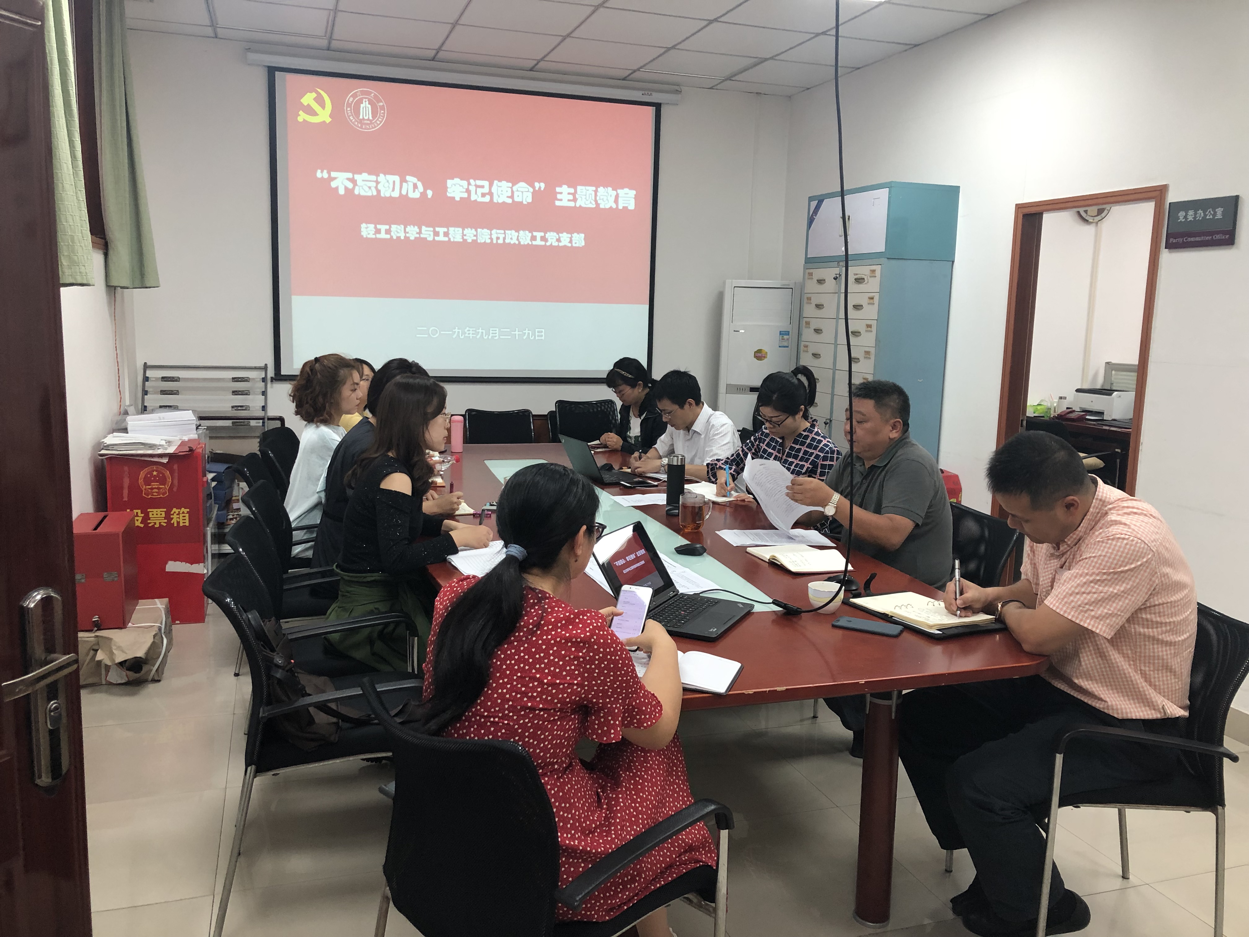 2019929日,行政教工支部在纺工附楼201开展了“不忘初心,牢记使命”主题教育活动第一次集中学习活动。活动开始,支部书记田彬介绍了此次主题教育活动的背景意义及具体要求,并强调下一步支部将按照校院两级党委的要求结合支部活动的开展,扎实开展好主题教育各项活动。支部党员同志围绕学习教育的具体安排及支部活动的开展进行了认真的讨论。讨论结束后,支部党员同志以视频学习的方式集体观看了习近平总书记在中央和国家机关党的建设工作会议和在中央党校(国家行政学院)中青年干部培训班开班式上的重要讲话精神等两个视频。