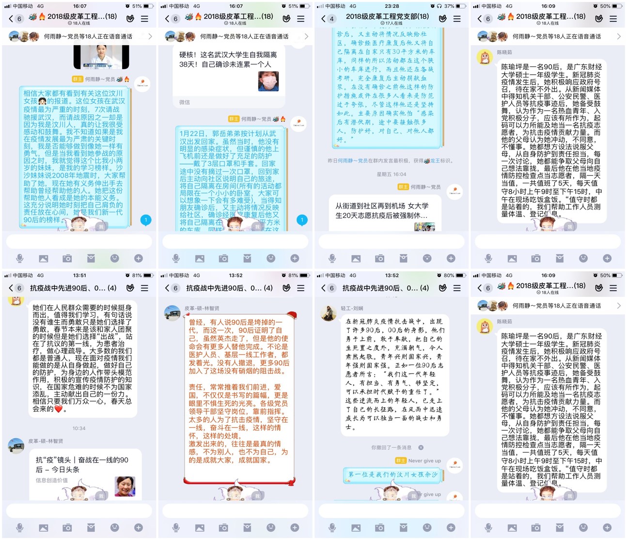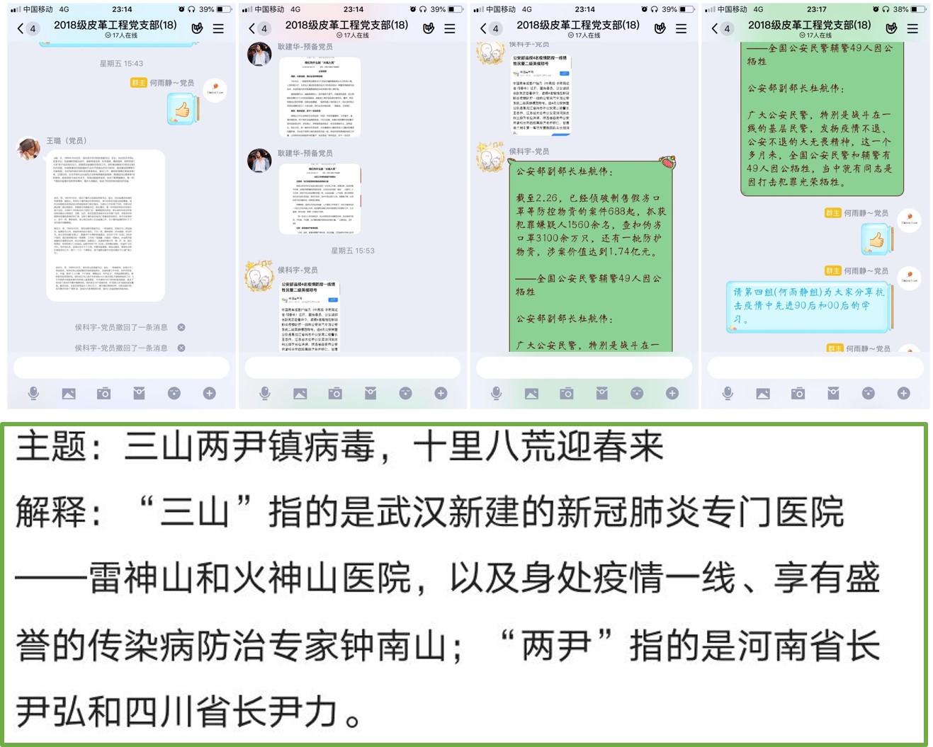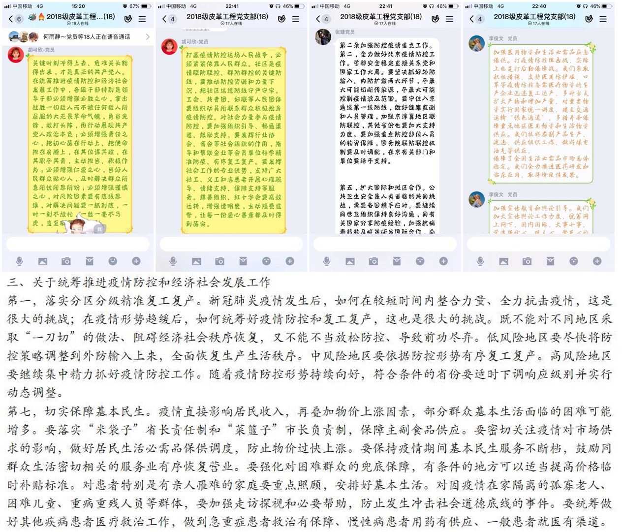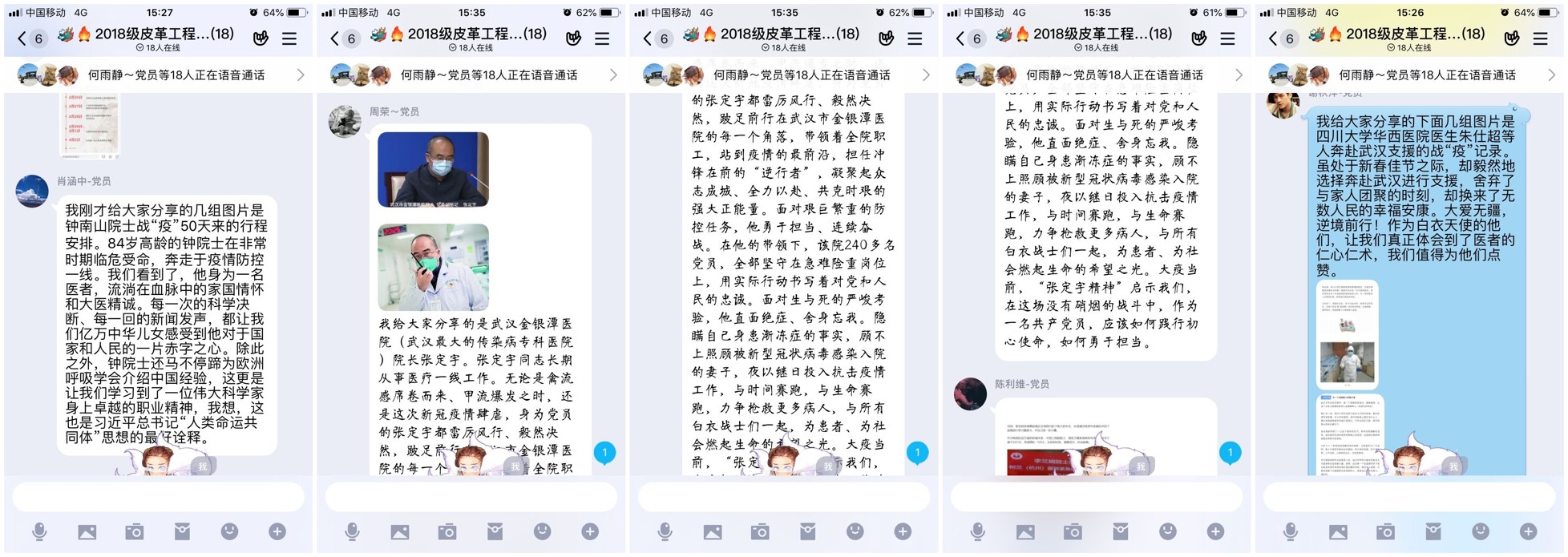 2020313日下午三点,2018级皮革硕士研究生党支部结合习近平总书记在疫情期间的讲话精神和奔赴前线的先锋模范代表事迹,召开了“同心抗疫,‘疫’路学习”云上主题党日活动,会议由支部书记何雨静同志主持,全体党员通过线上语音和文字交流方式参加。