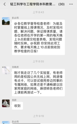 按照既定的督导工作安排,全体院系领导、督导组成员提前进入课程群,对教师线上教学的准备工作、学生到课率、授课质量、教学秩序等方面进行了认真检查,发现问题,协助解决问题,及时将检查情况报送学院。学院每天晚上10点前整理好当日查课情况总结,反馈给相关部门和人员。