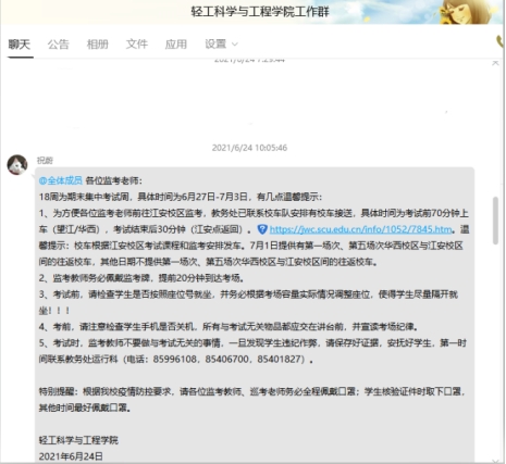 正式考试之前,本科教务员通过短信、QQ群等方式提醒监考老师监考注意事项。