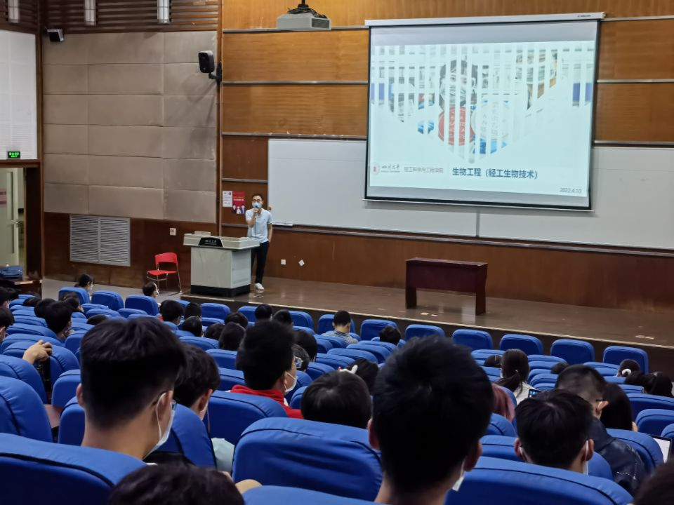 为加强四川大学生物工程(轻工生物方向)专业建设,增强学生学习主体性意识及导师引导责任意识。 2022年4月10日上午,于江安校区综合楼C407报告厅,轻工生物技术教研室面向2021级新生进行生物工程专业宣讲活动。