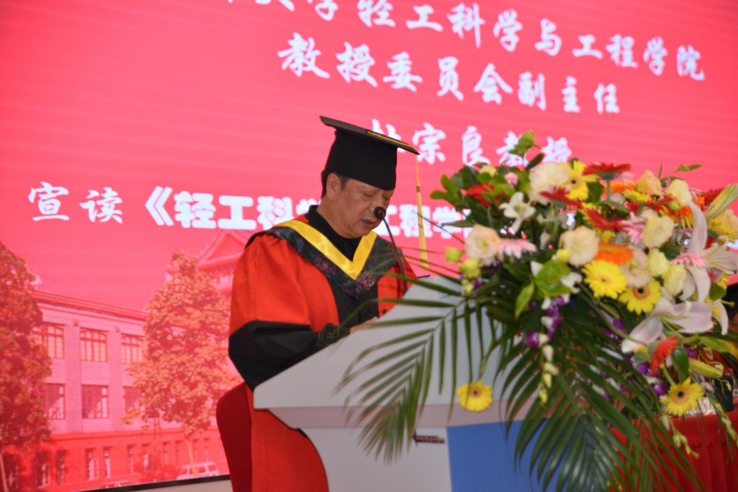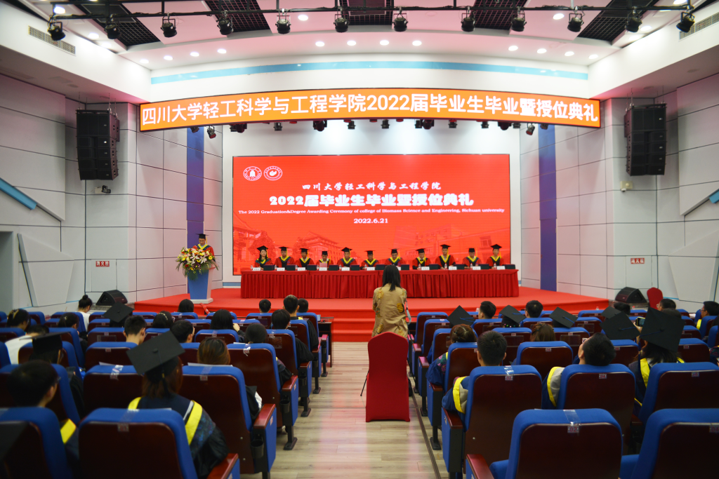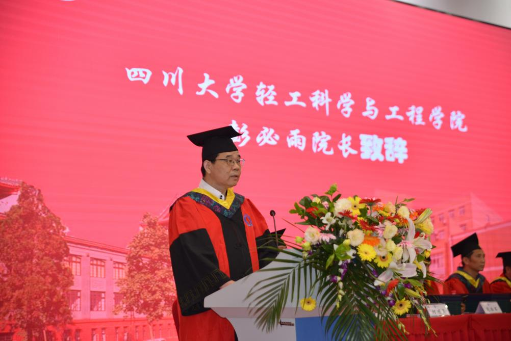 毕业暨授位典礼在庄严的国歌声中正式开始。首先,彭必雨院长代表学院党政致辞。彭院长向2022届圆满完成学业,获得学士、硕士、博士学位的同学们表示最热烈的祝贺!向前来参加毕业典礼的各位领导、导师代表、家长代表表示衷心的感谢!彭院长同与会人员一起回顾了学院近年来在学科建设、人才培养、科学研究等方面取得成绩。彭院长指出,这些成绩的取得离不开学院全体教师的集体智慧与辛勤工作,离不开学院全体同学的积极配合与全面参与,学院学科与专业的良好发展也定将是提升毕业生学历价值与社会认同的重要载体。过去的成绩永远属于我们每一位轻工人,未来的发展仍需全院师生和轻工校友们的鼎力支持。同时,彭院长向毕业生提出三点希望。第一、志存高远、不忘初心,做一个目标明确与意志坚定的人,坚定的朝着自己的生涯目标迈进。第二、脚踏实地、砥砺奋斗,做一个勤奋务实与追求卓越的人,用最美的奋斗去创造属于你的最美人生。第三、增强本领、服务行业,做一个常怀感恩与回报社会的人。希望同学们在奋斗中成就自我、回报社会,真正成为新时代的主人,在新的人生征程中创造出无愧于时代的辉煌业绩。