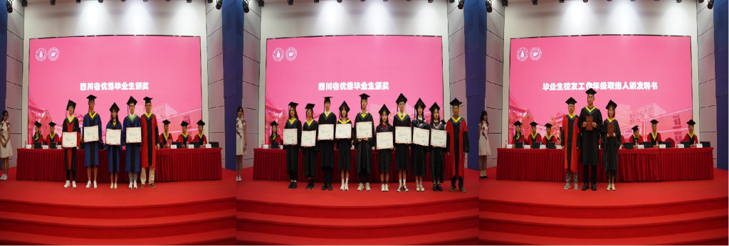 学院党委李天富书记宣读《bw必威西汉姆联官网2022届省优秀毕业生名单》和《2022届毕业生校友工作年级联络人聘任决定》,李天富书记、彭必雨院长、周建飞副院长分别为四川省优秀毕业生和校友联络人颁奖。