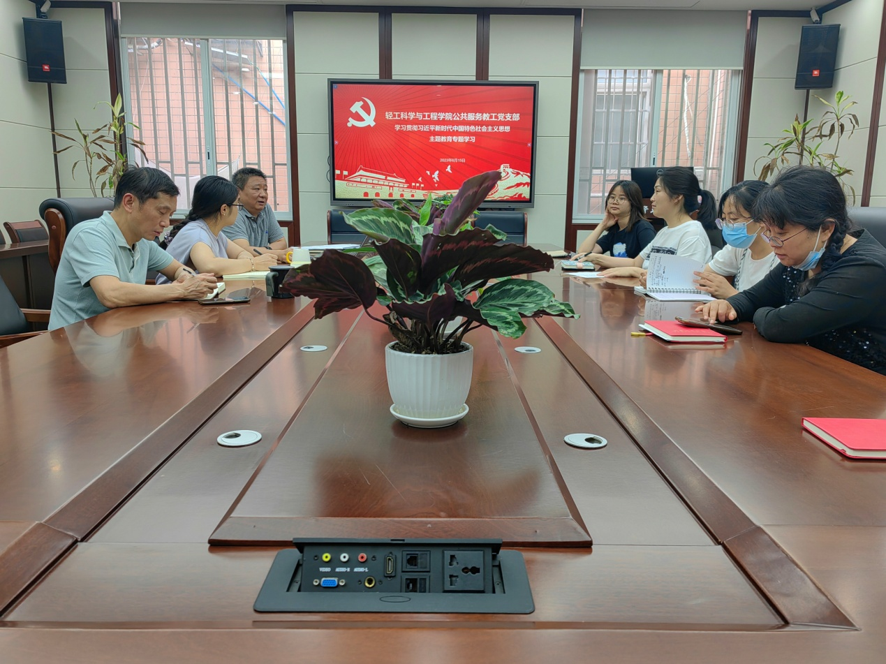 2023年615日下午,公共服务教工党支部在纺工附楼205会议室开展学习贯彻习近平新时代中国特色社会主义思想主题教育专题学习,支部全体党员参加了此次会议。